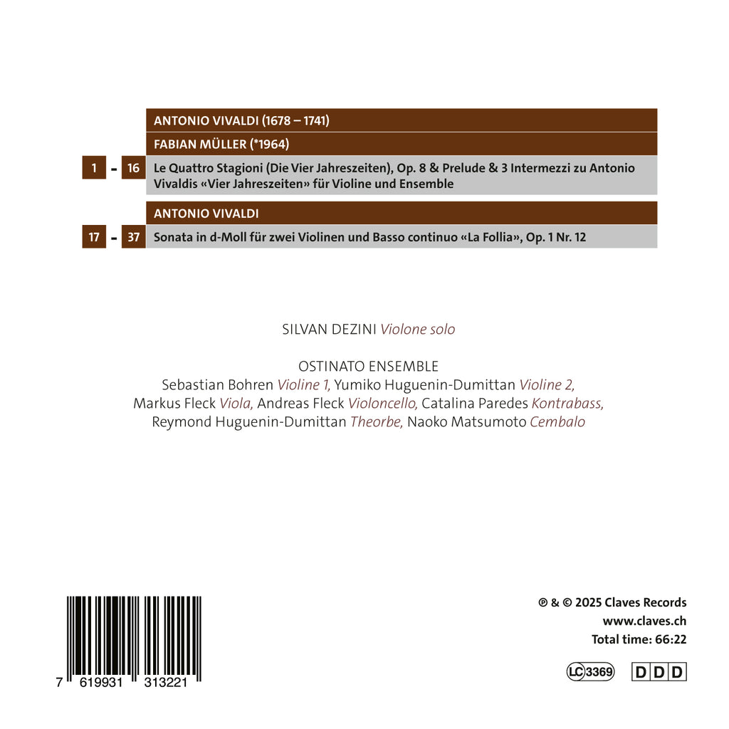 Swiss composer Fabian Müller takes a less radical approach. In 2016, on a commission from the Murten Classics Festival, he composed a Prelude and three Intermezzi for violinist Kamilla Schatz, each designed to precede Vivaldi’s violin concertos. Unlike Richter, Müller leaves the original intact, preparing the four concertos with evocative mood-pictures, “rolling out a red carpet for them”, as he puts it. Violinist Silvan Dezini, in this recording, strives to create a pure, unadorned version of The Four Seasons, aiming to render the sonic imagery of both Vivaldi’s and Müller’s compositions as faithfully to nature as possible. To this end, Dezini collaborated closely with Müller: “This helped me understand what Fabian was trying to express with his pieces, and I was able to discover new connections between Vivaldi and Müller.”